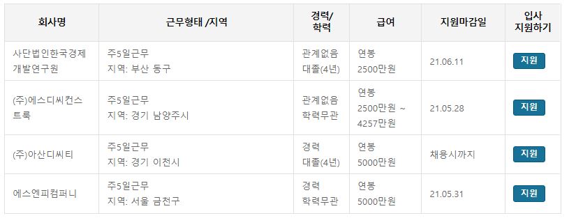 연봉 2500만원 선(2021. 5. 27. 워크넷 검색 목록)