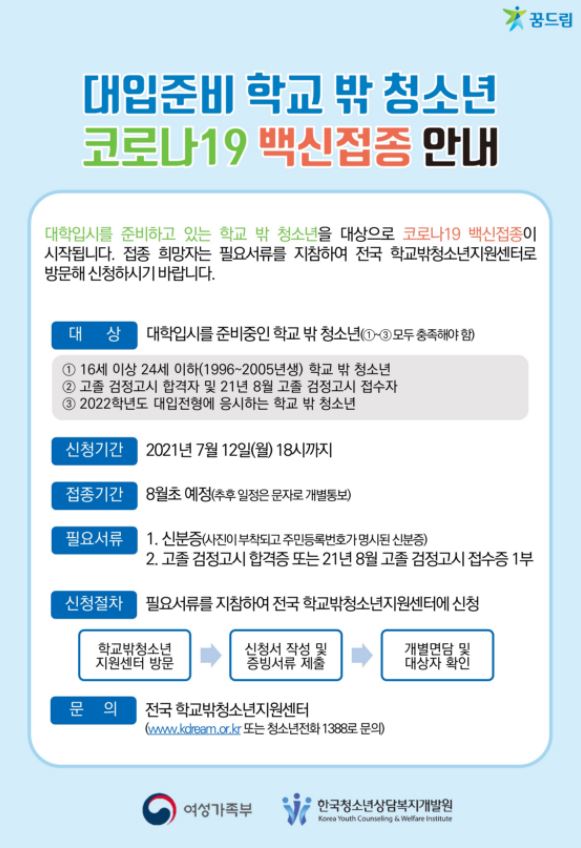 백신 접종을 희망하는 학교  청소년은 전국 학교밖청소년지원센(www.kdream.or.kr 또는 청소년전화 1388 문의) 방문하여 신청