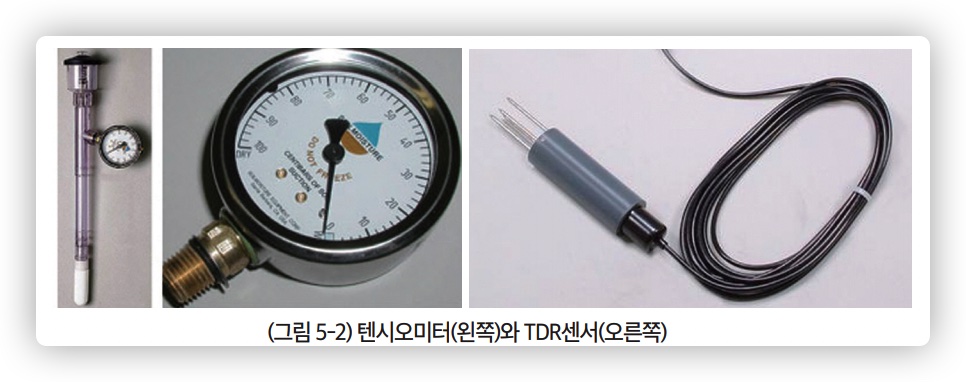 관수시점을 정하는데 실질적으로 사용할 수 있는 과학적 지표는 토양수분 조건이다. 토양수분 조건을 나타내는 방법으로 토양수분 장력(kPa)과 토양수분 함량(%)이 있다. 토양수분 장력은 식물이 토양에서 물을 흡수하는데 드는 힘을 반영 하므로 관수시점을 결정하기 위해 바로 사용할 수 있다. 토양수분 함량은 토양 내에 물이 있는 양을 나타내기 때문에 물관리에 활용하기 위해서는 토양수분 장력 으로 환산하여야 한다.