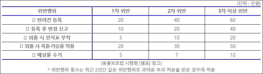 이번 집중단속 기간에는 반려견의 주 이용 장소를 중심으로 반려견 소유자의 준수사항 이행 여부를 점검하고, 위반 시에는 과태료를 부과할 계획이라고 합니다.