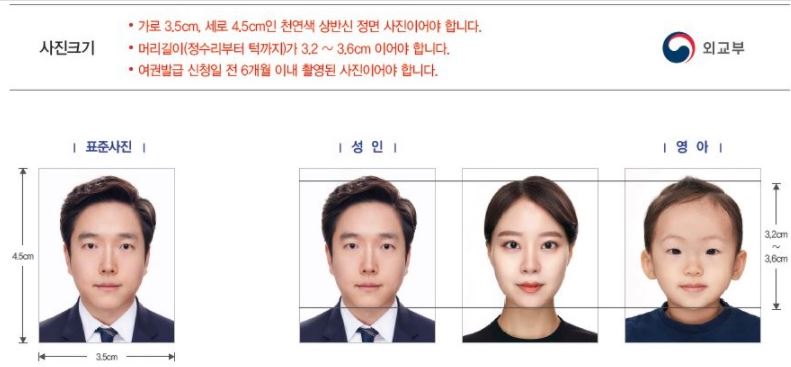- 최근 6개월 이내에 촬영한 천연색 정면사진으로 얼굴양쪽 끝부분 윤곽이 뚜렷해야하며 상반신은 어깨까지만 나와야 하고 양 어깨가 나란히 위치하고 있어야한다.
