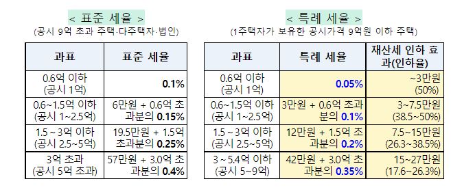 특례세율 적용으로 공시가격 1억원 이하 주택은 재산세가 최대 3만원, 1~2.5억원 이하는 3~7.5만원, 2.5~5억원 이하는 7.5~15만원, 5~9억원 이하는 15~27만원이 줄어들게 됩니다.