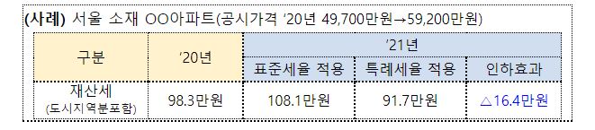 지난해 공시가격이 4억 9,700만원에서 올해 공시가격이 5억 9,200만원으로 상승한 서울 소재 OO아파트의 경우 재산세 특례세율 적용 시 재산세가 108.1만원에서 91.7만원으로 16.4만원 줄어듭니다.