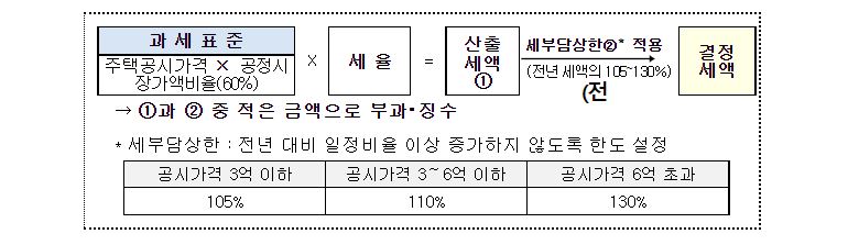 과세표준에 세율을 곱해 산정한 산출세액 세부담상한을 적용한 세액 비교하여 적은 금액으로 부과・징수하게 됩니다.