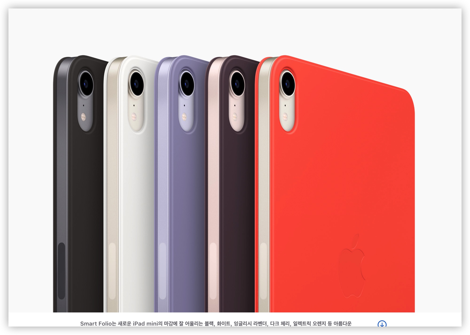 - 새로운 iPad mini용 Smart Folio는 블랙, 화이트, 다크 체리, 잉글리시 라벤더, 일렉트릭 오렌지 색상으로 제공되며, 75,000원에 구매할 수 있다.