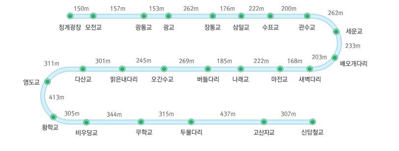 청계천은 2003. 7. 1. 2005. 9. 30. 약 2년 3개월간 공사기간을 거쳐 사람들이 거닐 수 있는 문화공간으로 탈바꿈되었습니다. 복원된 청계천 다리는 총 22개이며, 분수 총 12개, 진입로 총 57개소 두고 있습니다.