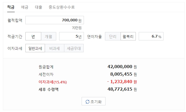 단순 월복리 적금이자로 계산할 경우 월 70만원씩 5년을 납부했을 때 6.7%의 금리혜택입니다. 이 정도 혜택은 현재 시중은행에서 볼 수 없는 금리입니다.