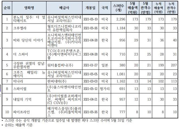 한국영화로는 <비와 당신의 이야기>가 29억 원(31만 명)의 매출을 기록해 5월 전체 흥행 순위 3위에 오른 것이 최고 성적이었다.