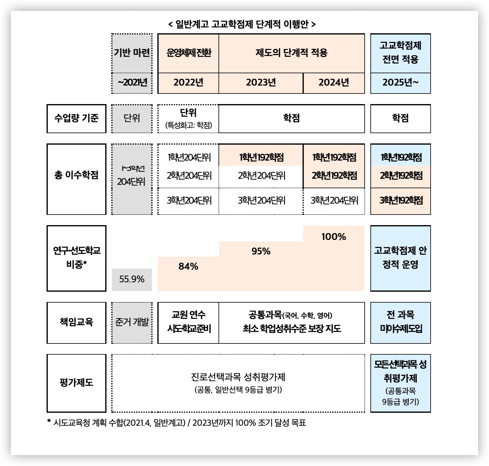 2025년 학생 맞춤형 교육체제의 완전한 안착을 목표로, 고교학점제의 단계적 이행은 2021년 기반 정비를 거쳐 2022년부터 이루어집니다.