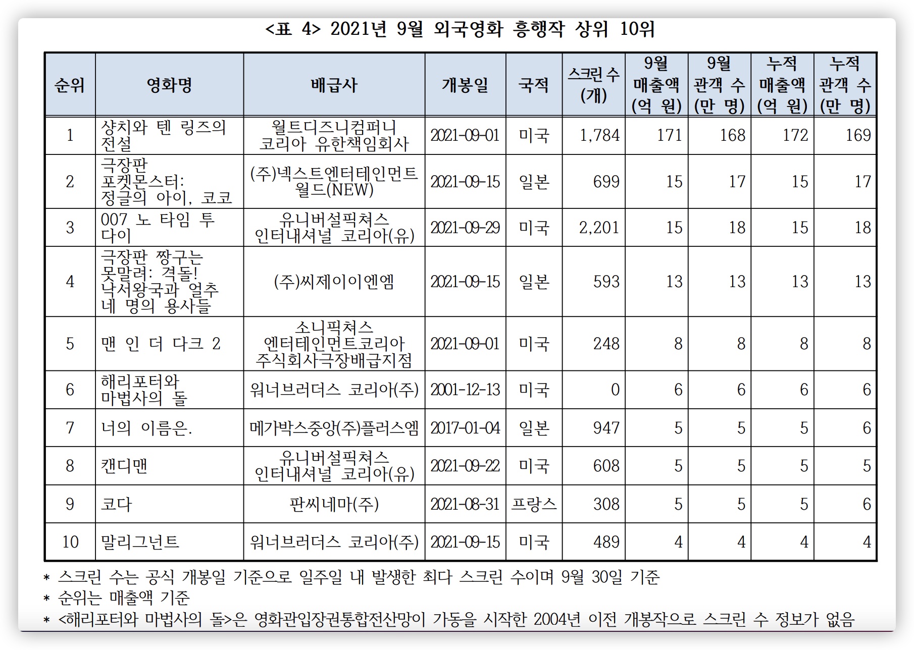 9월 외국영화 흥행작 순위