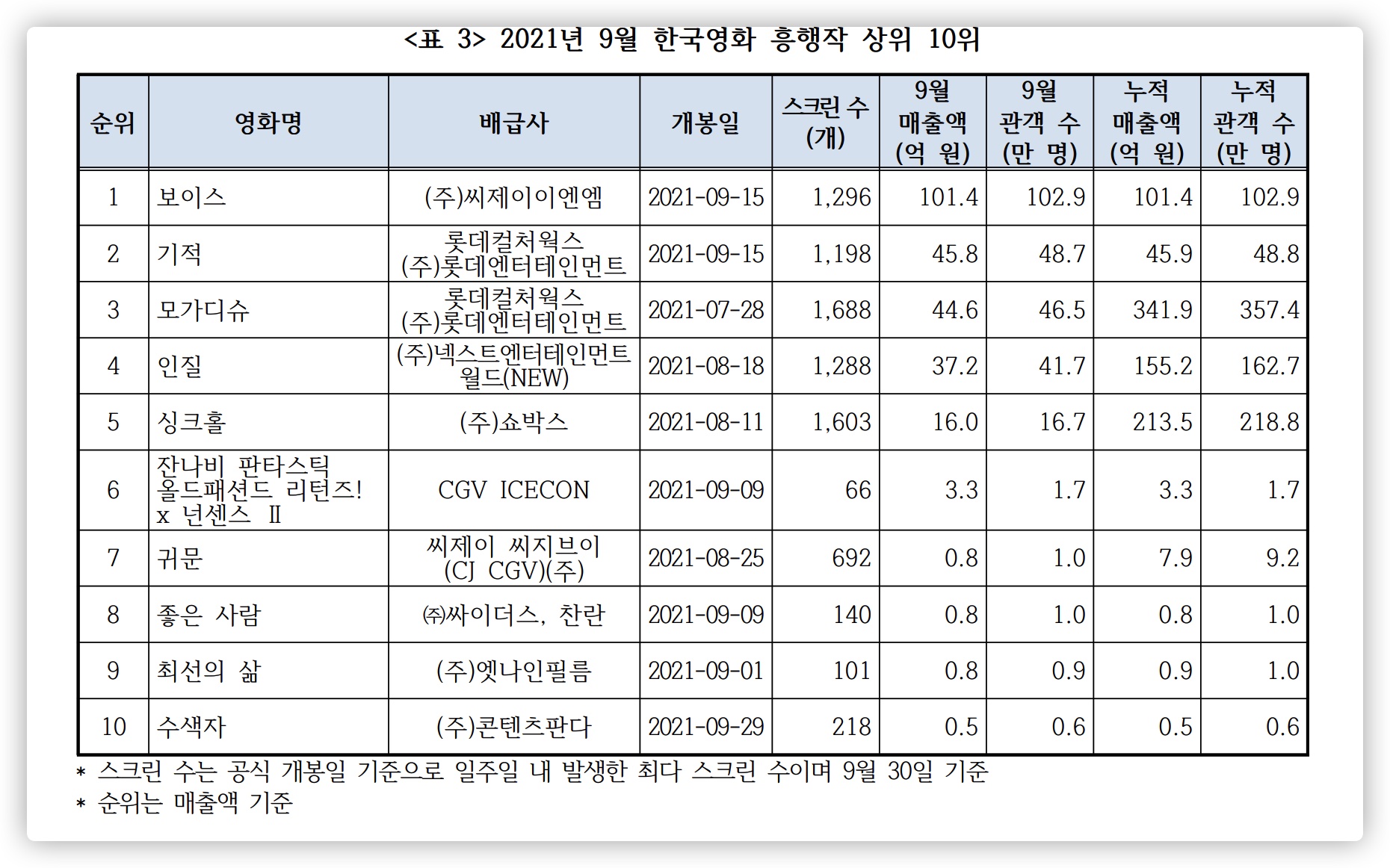 9월 한국 영화 박스오피스 흥행 순위