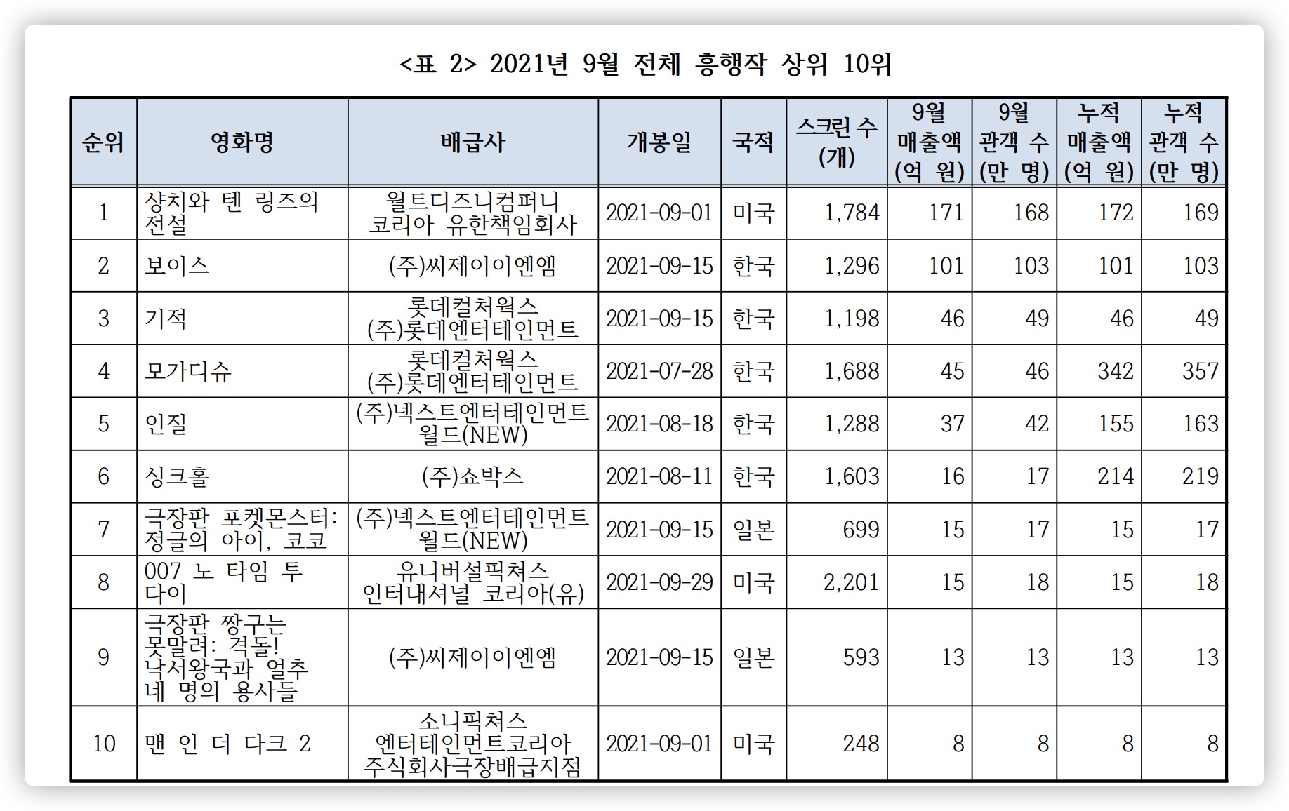 9월 45억 원(관객 수 46만 명)의 매출로 전체 흥행 4위였고, 9월까지 342억 원(누적 관객 수 357만 명)의 누적 매출을 기록해 2021년 1 ~ 9 월 누적 기준 전체 흥행 1위였다.