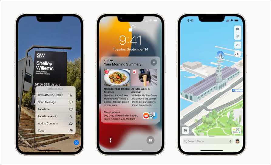 iOS 15의 지도 앱은 세계를 탐험하는 완전히 새로운 방식을 선보인다. 아름다운 비주얼을 보유한 지도 앱은 동네, 상업 지구, 건물, 맞춤 디자인된 랜드마크, 달빛을 비추는 것과 같은 새로운 야간 모드 등 크게 향상된 도시의 디테일을 제공한다. 네비게이션 기능은 도로 디테일이 포함된 새로운 3차원 주행 뷰를 통해 사용자들이 쉽게 회전 차선, 중앙선, 횡단보도, 보행자 도로 등을 식별할 수 있도록 돕는다. 향상된 지도 앱은 로스앤젤레스, 뉴욕, 샌프란시스코 등에서 활용 가능하며, 추후 다른 장소에서도 추가될 예정이다. 아름답게 디자인된 인터랙티브 지구본 기능은 산악 지대, 사막, 열대우림, 수역 등의 지역에 대한 풍부한 디테일을 제공한다.
