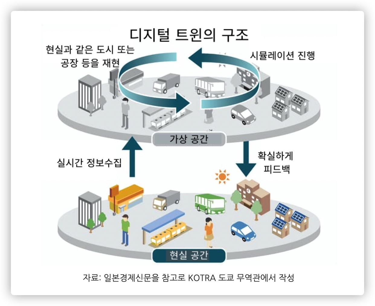 디지털 트윈이란, 물리 세계(현실 세계)에 실재하고 있는 것을 디지털 공간에서 리얼하게 표현한 것을 가리킨다. 현실 공간의 구조나 가동 상황 등을 가상 공간에 구축해 리얼한 시뮬레이션을 가능하게 하는 기술이다. IoT가 보급돼 모든 물건의 데이터 취득이 가능하게 된 것으로, 디지털 트윈의 기술도 비약적으로 진화했다.
