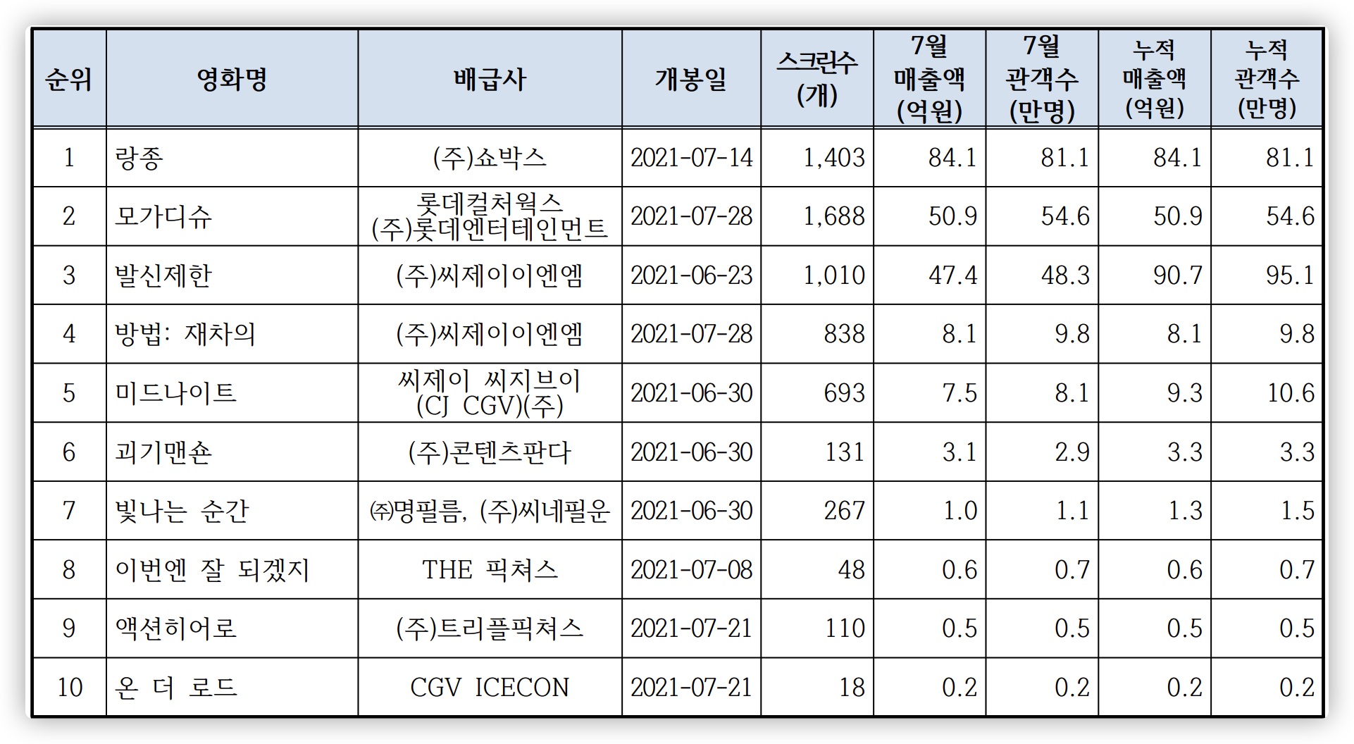 2021년 7월 한국 영화 박스오피스 흥행 순위